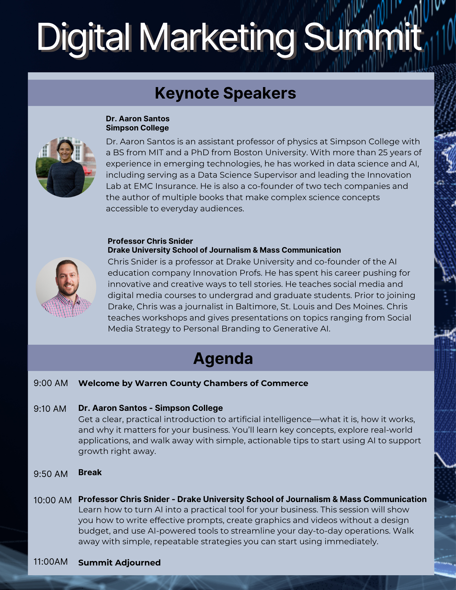Featuring sessions from Dr. Aaron Santos of Simpson College and Chris Snider of Drake University School of Journalism & Mass Communication, you’ll gain a clear understanding of what AI is, how it works, and what it can realistically do for your business—before diving into how to actually use it.